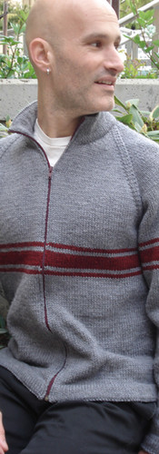 Ed's argyle motif is featured on the front and back of his zipper cardigan. Argyle patterns can be knit using stranded colorwork (carrying unused yarn colors behind work) or intarsia (color blocking). Modern patterns for garments knit with argyle colorwork are scarce these days but you can occasionally find vintage patterns designed with the argyle motif online. You can also work up a basic zippered cardigan and follow a separate argyle chart (such as these) to add the colorwork yourself to the front and back panels if you are clever!
